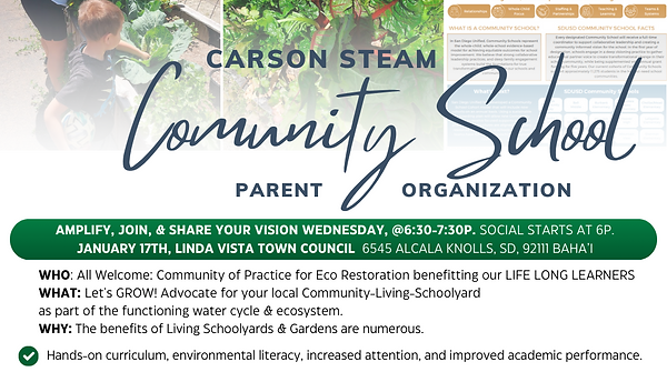 Carson STEAM Elementary Community School Parent Organization community & Eco Restoration Community Endeavors for a whole-child, whole-school evidence-based model for continuous improvements. https://ccgbambino.wixsite.com/bambino-arts/ecorestorationcommunities